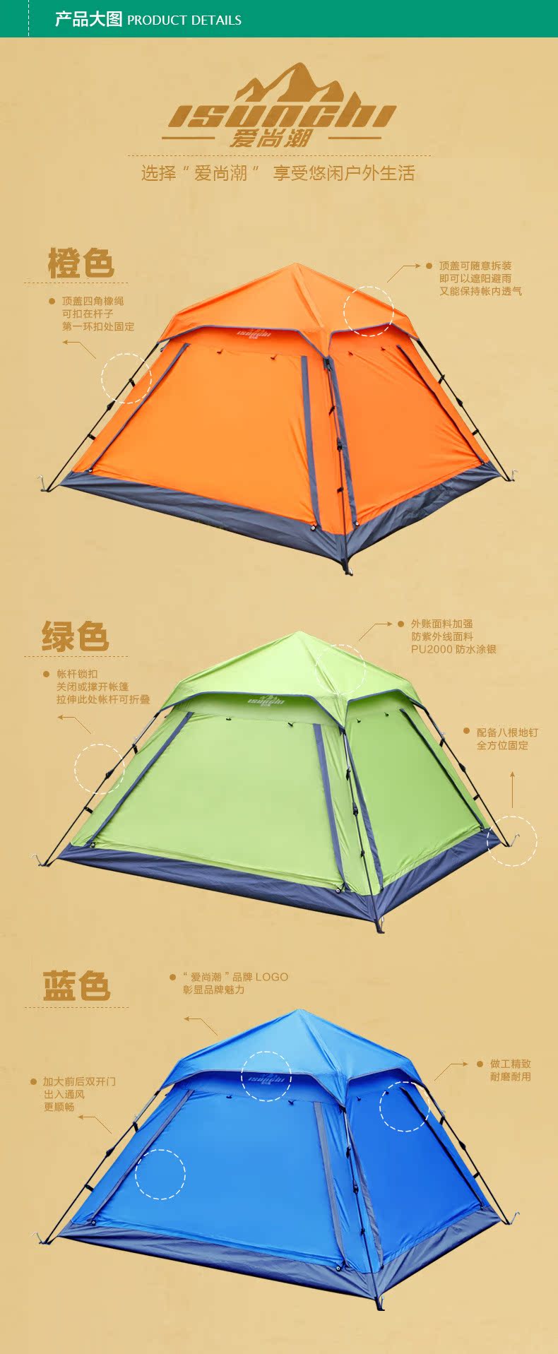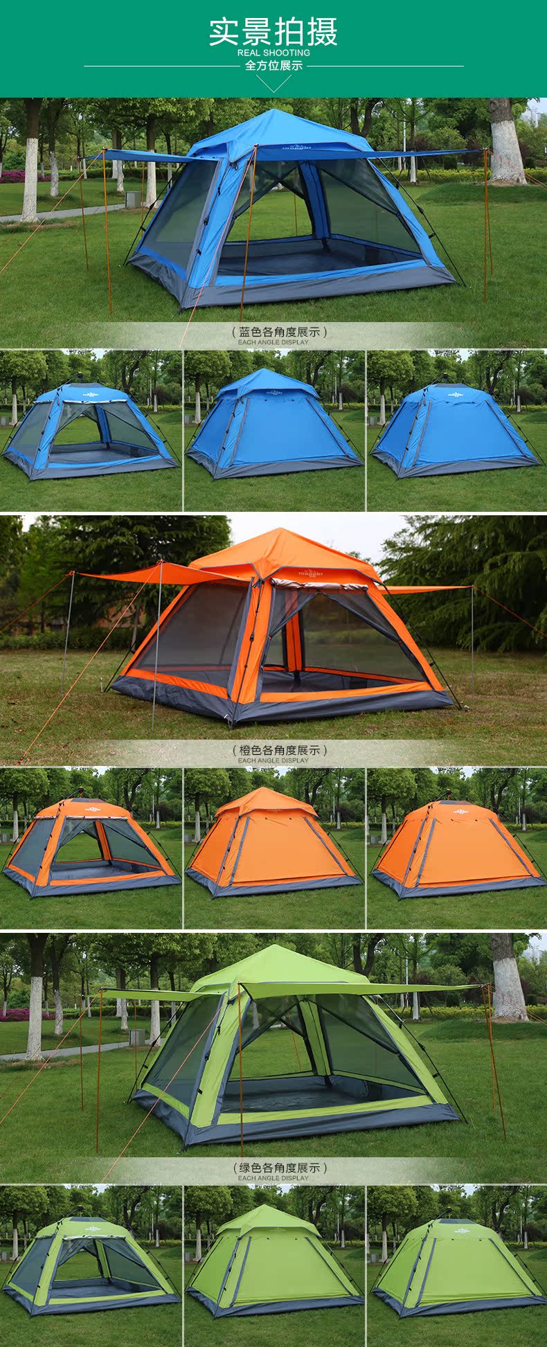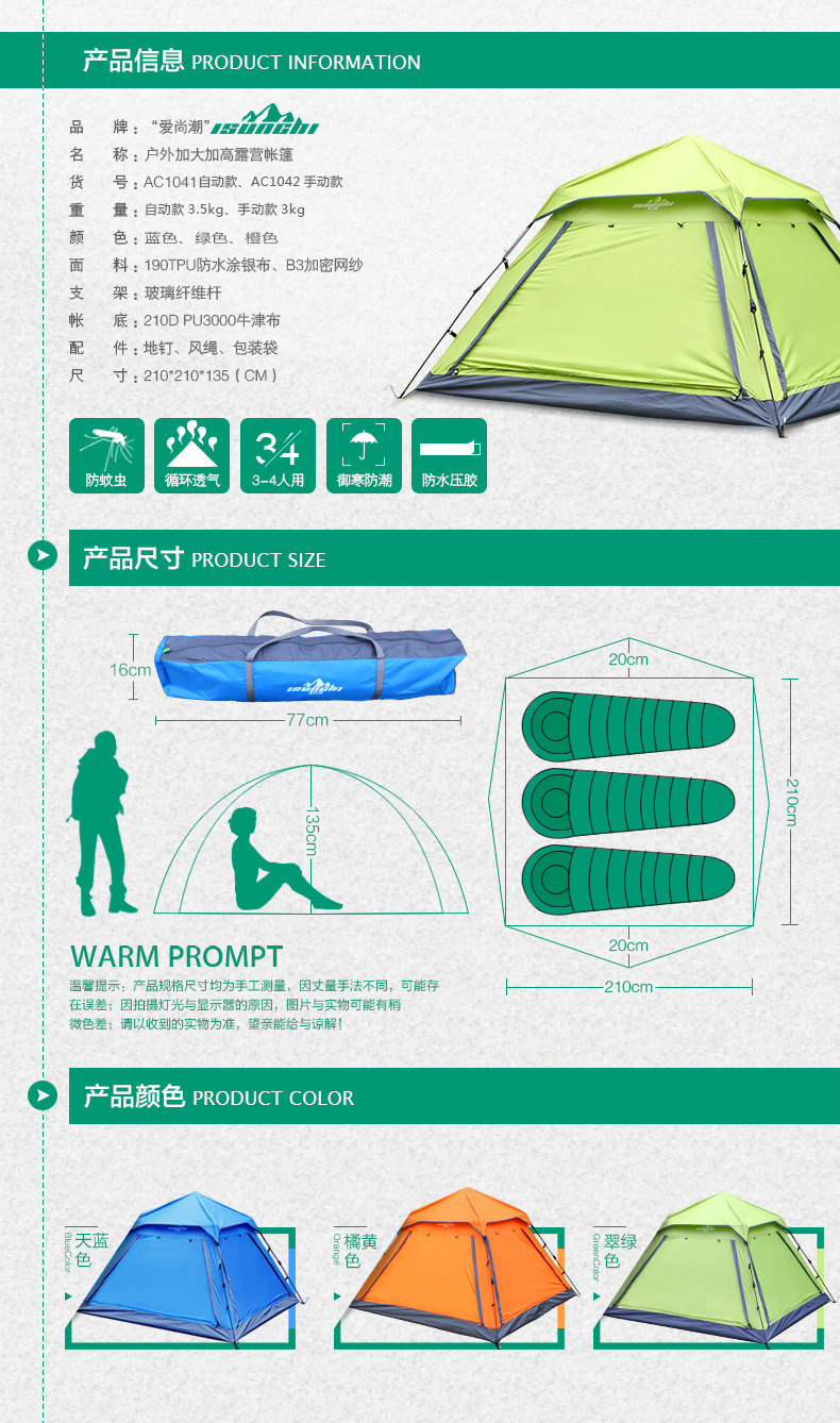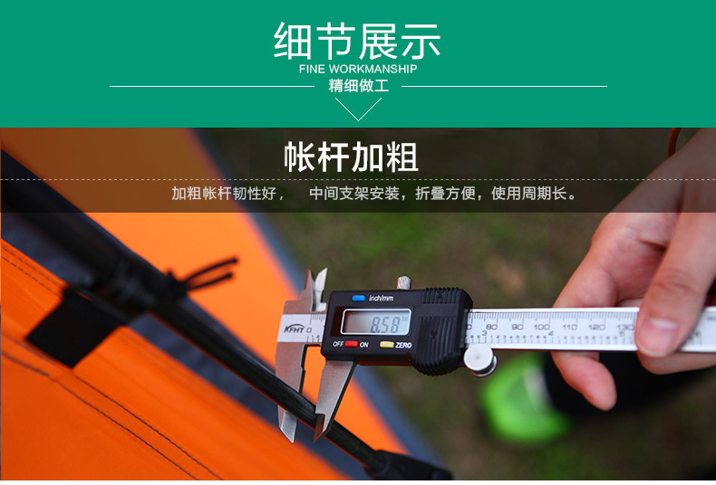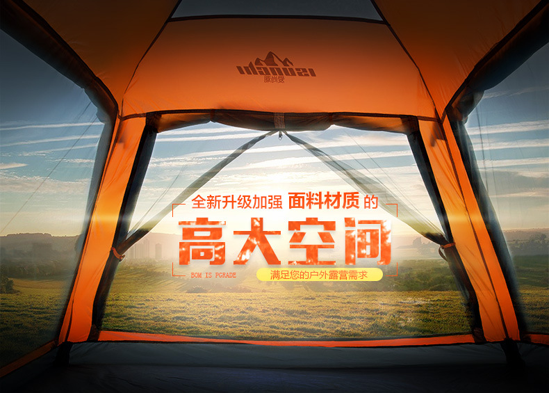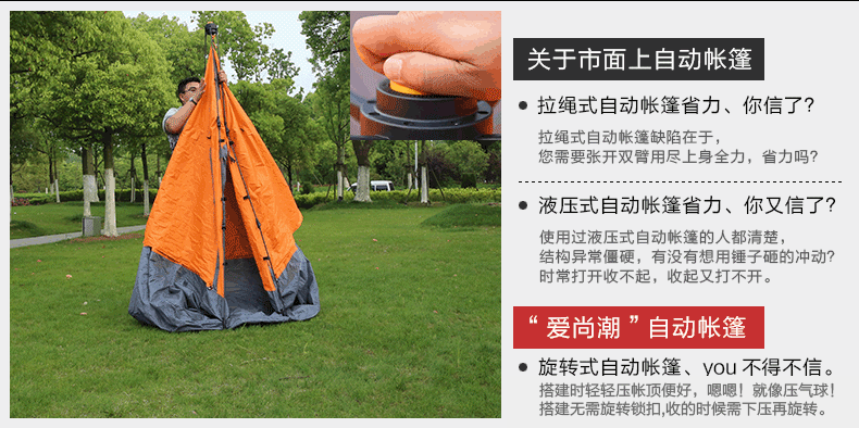 亲们!现在自动款的杆子顶部已经升级成不用旋转的了!直接将帐篷提起,撑开帐篷杆子就可以下压固定住!收帐篷的时候仅需下压,旋转按钮,即可解锁!包装袋内的说明书是老款的杆子,请勿参考!